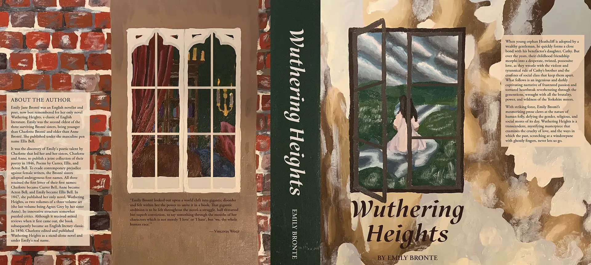 For the cover, I extensively researched the Romanticism Period and what it meant for both art and literature. After that, I painted the cover of the book in acrylics. The front cover is a window looking to a beautiful outdoor landscape with the inside of the house being run down and ragged, while the back cover is a window looking toward the inside where the outside is what is run down bricks with a beautiful interior. The dichotomy of the front to back meant to represent the classism and struggle the characters face in the book with notes of being haunted by those left behind. The window to the outside shows a lone figure, a literal ghost in the environment, while the inside shows an empty space where ghosts of people get left behind.